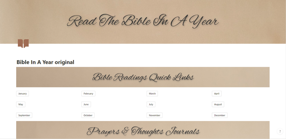 A fully comprehensive Notion Template for reading the Bible in a year and recording and tracking your journey, prayer and spiritual life.