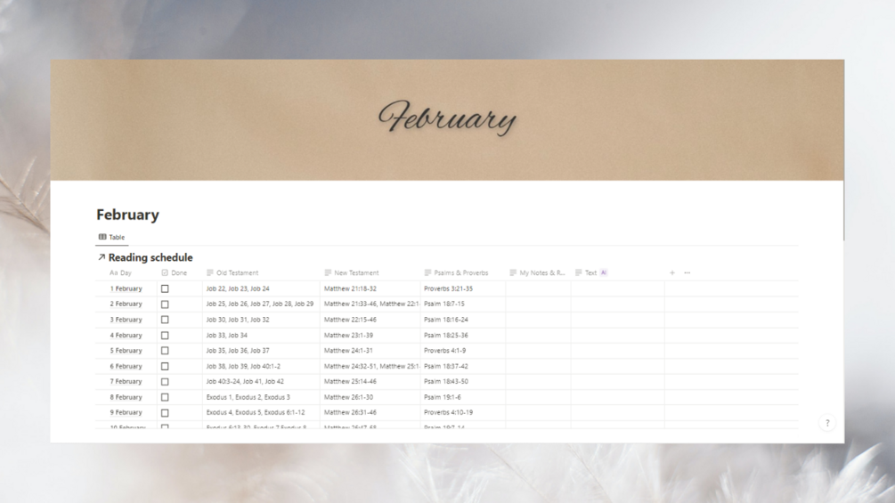 This Notion template includes a month-by-month, day-by-day reading plan from the Old Testament, New Testament, Psalms, and Proverbs. There's also a place to journal your notes and findings, as well as an AI section that generates the themes of the day's reading.