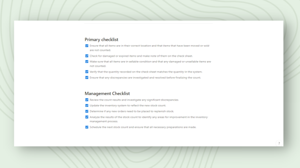 This simple but effective stock count Notion template is perfect for businesses of all sizes. It includes everything you need to keep track of your inventory, from codes and items to location and quantity. The template also includes pre-made checklists to help you stay organized and efficient.
